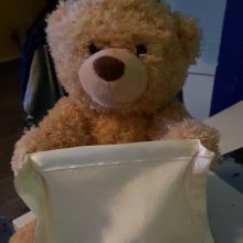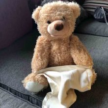 The peek a boo bear was an adorable addition to my 6 month old's collection of stuffed animals. The game of peek a boo is one of her favorites but, she is quite the aggressor LOL. She no longer wished to play the game with the bear and decided she wanted his blanket. Mr. Bear went to cover his eyes and my 6 month snatched his blanket from detaching it from one of his cute unsuspecting paws. It's an easy fix. The voice over is so precious. It would be awesome if there was an option to order the bear with your child's name in place of "baby." I'd definitely order this product for future babies in my family. It's a keeper. Thank you for producing an adorable keepsake!!