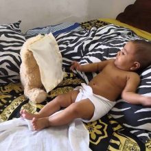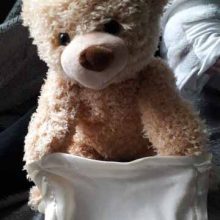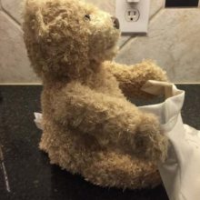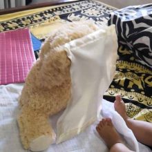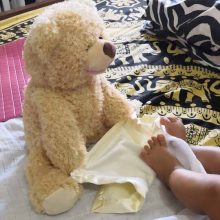 I bought this bear for my 8 mos old granddaughter, but my 2-year-old grandson won’t let her play with it. He loves it so much and is amused with the bear pleating peek-a-boo!