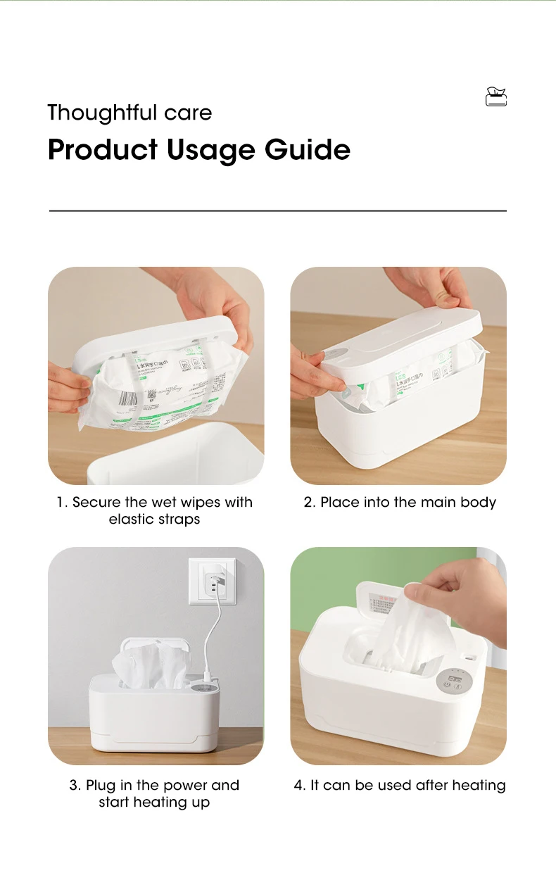 [Even Heating and Thermostat] This baby wipe warmer features even heating, heating the wipes in all directions until reaching a comfortable temperature that is suitable for baby's delicate skin. And the baby wipe warmer has a built-in temperature sensor, after heating it will remain at a constant temperature. No need to worry about accidents.